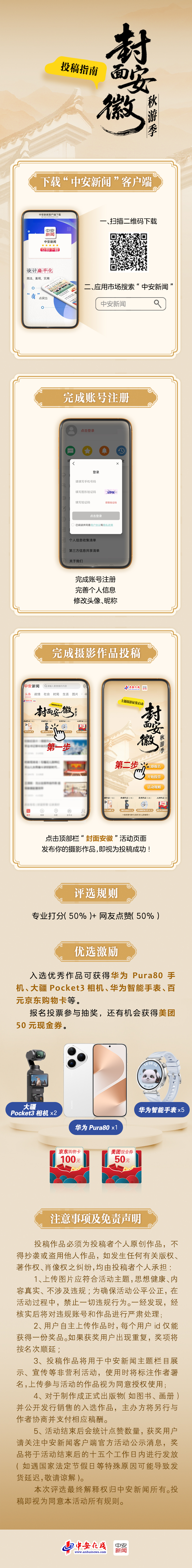 “封面安徽”系列主題攝影征集活動(dòng)是由中安在線、中安新聞客戶端主辦,安徽省攝影家協(xié)會(huì)指導(dǎo),活動(dòng)立足于安徽獨(dú)特的自然風(fēng)光與人文底蘊(yùn),通過(guò)每日精選影像內(nèi)容,全方位展現(xiàn)江淮大地的自然之美、人文之韻和發(fā)展之新。本次“秋游季”投稿的優(yōu)秀作品將同步發(fā)布至“封面安徽”進(jìn)行專(zhuān)題展示,活動(dòng)還準(zhǔn)備了手機(jī)、相機(jī)、智能手表等獎(jiǎng)勵(lì),無(wú)論你是專(zhuān)業(yè)攝影師、攝影發(fā)燒友,還是隨手記錄生活的手機(jī)黨,只要你熱愛(ài)安徽,捕捉到打動(dòng)人的瞬間,就是我們要找的“封面攝影師”!