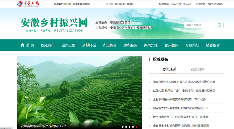 脫貧攻堅(jiān)取得勝利后,全面推進(jìn)鄉(xiāng)村振興,是“三農(nóng)”工作重心的歷史性轉(zhuǎn)移。在安徽省鄉(xiāng)村振興局5月28日正式掛牌當(dāng)天,由安徽新媒體集團(tuán)主管主辦、安徽農(nóng)業(yè)大學(xué)新農(nóng)村發(fā)展研究院協(xié)辦,以聚焦鄉(xiāng)村振興、服務(wù)安徽“三農(nóng)”為宗旨的《安徽鄉(xiāng)村振興網(wǎng)》(中安在線鄉(xiāng)村振興頻道)也正式開通上線。