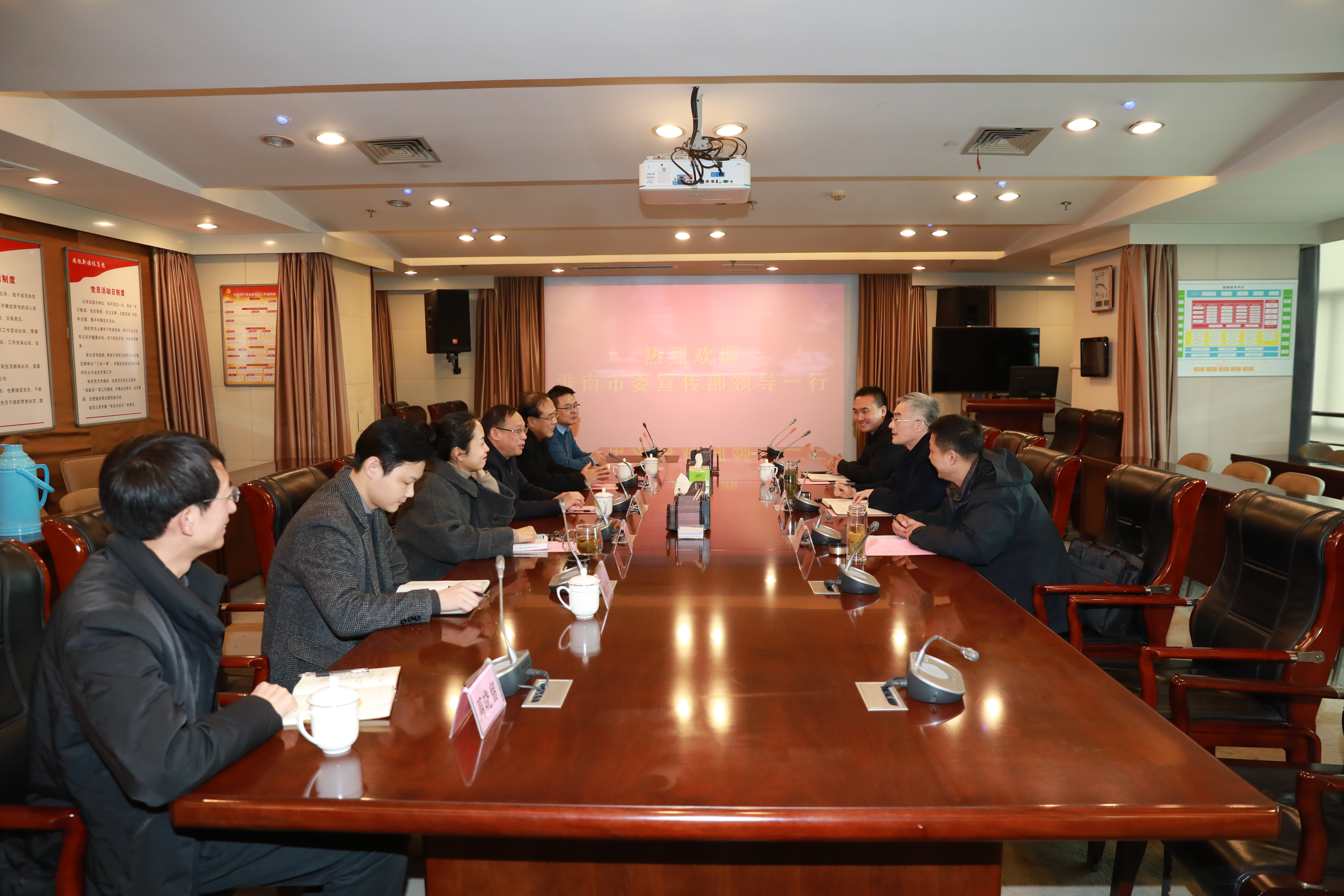 2月21日上午,淮南市委常委、宣傳部部長鄔平川,市委宣傳部副部長吳波,市委宣傳部辦公室主任馬浚一行赴安徽新媒體集團走訪調研。集團黨委書記、董事長、總經理章理中,集團黨委委員、副總經理陳鵬運等參加,雙方圍繞如何深入合作,做好新聞宣傳、活動策劃、新媒體產品制作等方面進行了認真交流。