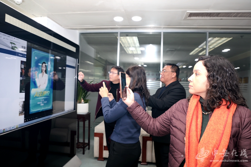 研修班一行現場觀摩了中安在線網站、中安英文網以及中安新聞客戶端等平臺的功能演示,在融媒體“中央廚房”觀看了安徽文旅英文宣傳片,并走進全媒體演播室,實地了解新聞內容從策劃、采集到制作、分發的全流程一體化運作模式。參觀過程中,集團的數字主持人技術引起大家濃厚興趣,充分展示了集團在智能媒體融合方面的創新探索。