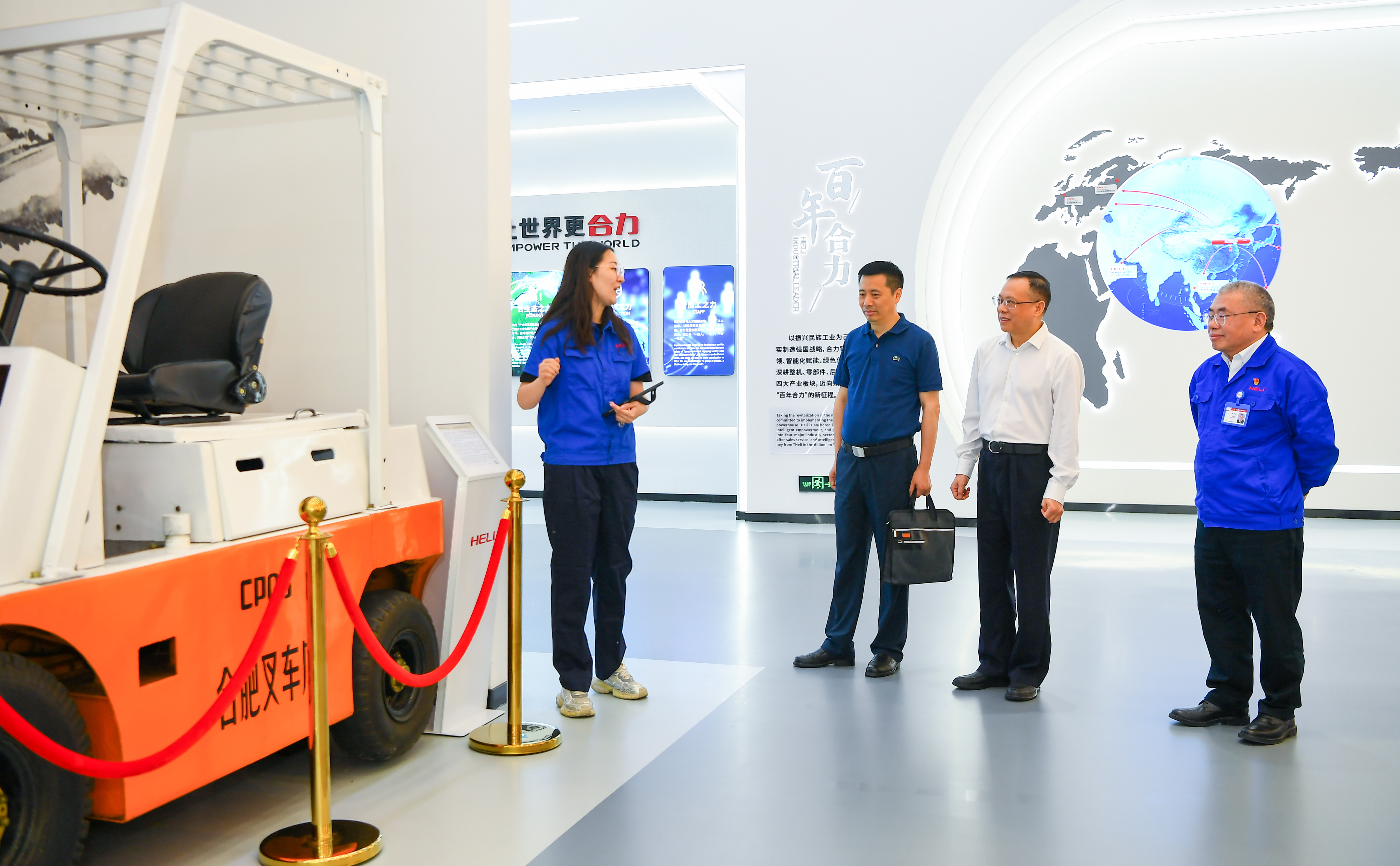 章理中一行首先參觀了合力數(shù)字化展廳。據(jù)介紹,安徽叉車集團(tuán)是安徽省屬全資國有企業(yè),始建于1958年,至今已有66年的發(fā)展歷程,是國家創(chuàng)新型企業(yè)、國家火炬計劃重點高新技術(shù)企業(yè)、安徽省工程機(jī)械建設(shè)(合肥)基地龍頭企業(yè)。其主營業(yè)務(wù)有工業(yè)車輛、智能運搬裝備、智能物流系統(tǒng)及核心零部件等。截至目前,企業(yè)主要經(jīng)濟(jì)指標(biāo)連續(xù)33年全國同行業(yè)前列,并于2016年躋身世界工業(yè)車輛行業(yè)七強(qiáng)。
